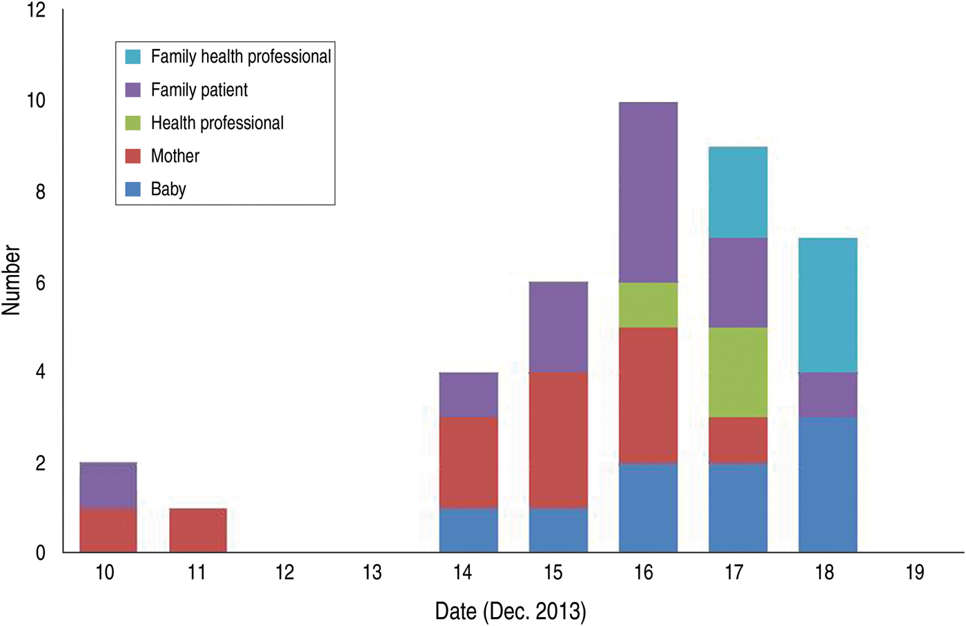 The following week out of a total of 15 mother–infant pairs admitted in the unit, two mothers and nine mother–infant pairs were attacked by bed bugs. A total of 39 individuals were affected in this outbreak. A detailed epidemic curve was prepared and analysed (Fig. 2). It was established that the infestation was due to a point-source outbreak with limited spread. The infestation had probably originated from one mother admitted on 10 December 2013. The blanket she had brought from her home was later observed to be heavily infested. From her, bed bugs spread to involve the adjacent mothers and mother–infant pairs. Eleven family members of three of these mothers were subsequently affected as a result of transferring bed bugs from the neonatal unit to their own home, presumably via clothing and other belongings. One of the three resident doctors (all three had bed bug bites) posted in the unit transferred the bed bugs to her home resulting in bites to all five of her family members. The clinical features of the affected persons have been summarized in Table 1. Newborns primarily experienced an inability to sleep due to bed bug bites. Papular rash and itching were the most common manifestations in adults. All affected individuals responded to symptomatic treatment consisting of emollient cream and antihistamine. Only two mothers and one family member required antibiotics for control of folliculitis.
