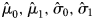 $\hat{\mu} _0, \hat{\mu} _1,\hat{\sigma} _0,\hat{\sigma} _1$ and the estimated seroprevalence per age group, calculated as the weighted mean of the age-specific seroprevalences.