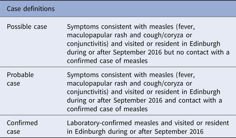 Table 1. Case definitions used throughout the outbreak of measles in Edinburgh from September 2016 onwards