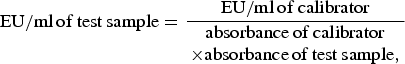 $${\rm EU/ml\,of\,test\,sample} = \displaystyle{{{\rm EU/ml\,of\,calibrator}} \over {\matrix{{\rm absorbance\,of\,calibrator} \cr \times {\rm absorbance\,of\,test\,sample},} }}$$