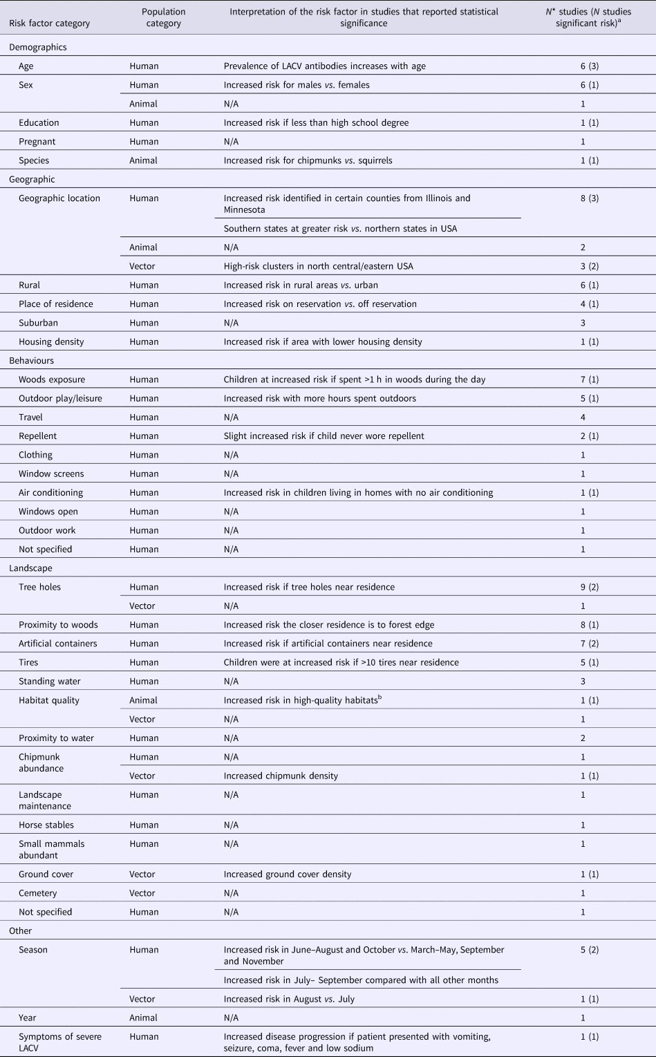 Table 2. The number of articles reporting risk factors for La Crosse virus (LACV) studied in human (N = 36), animal (N = 3) and vector (N = 5) populations