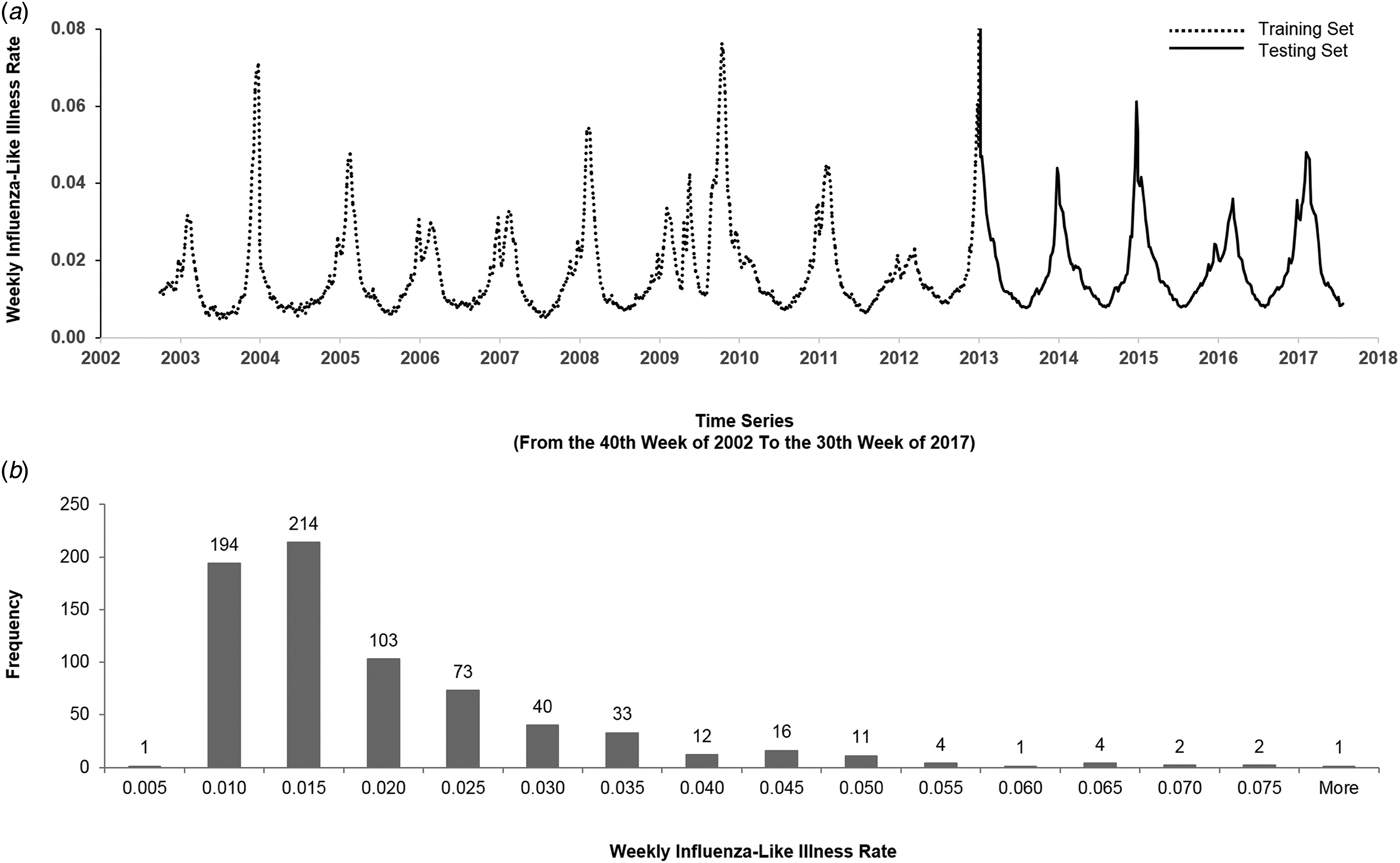 Figure 1(b) describes the histogram of the weekly ILI rates. The histogram is right-skewed. Generally, comparing accuracy of models by mean absolute percentage error (MAPE) mainly reflects the difference of the ‘median’; while comparing by root mean square error primarily reflects the difference of the ‘mean’. The right-skewed histogram and the Kolmogorov–Smirnov test (P < 0.05) showed that the US flu data followed a non-normal distribution. Therefore, we expected that the accuracy would reflect the difference of ‘median’ and thereby used MAPE as a key performance indicator (KPI) for comparing models.