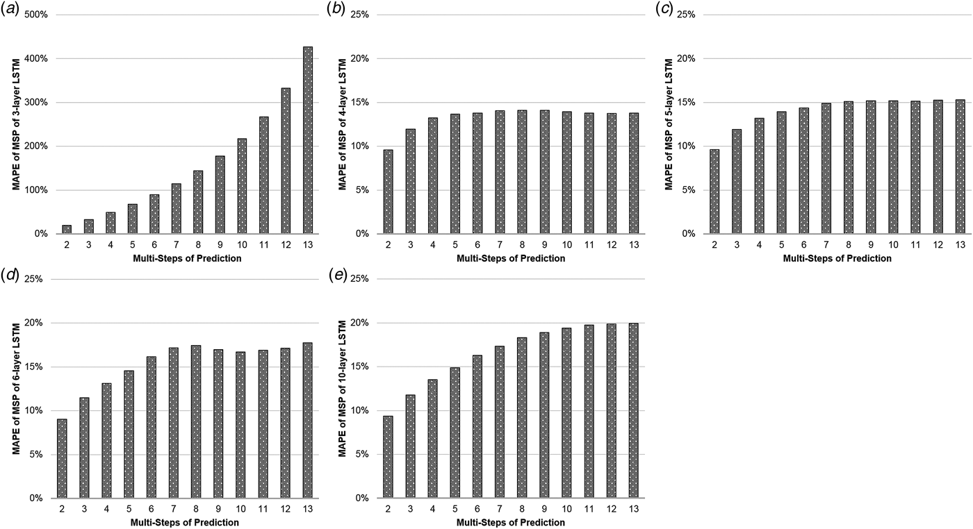Fig. 2. The MAPEs of LSTM with MSP. The y-axis represents the MAPE of the predictions and the x-axis represents multi-steps of the predictions. The (a–e) illustrate the MAPEs with the MSP algorithm of three-, four-, five-, six-, 10-layer LSTM, respectively.