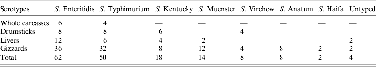 Gizzard samples proved to be the most contaminated (30/50) of tissue samples and yielded each of the seven serovars detected from all samples. The absence of certain serovars such as S. Virchow, S. Anatum, and S. Haifa from some of the other sample types no doubt reflects their low overall frequency and perhaps less cross-contamination during preparation.