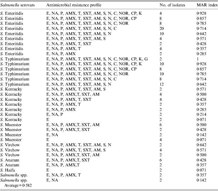 Only 12 (7·2%) of the 166 isolates exhibited resistance to just one or two antimicrobials and these comprised the less frequently occurring serotypes, S. Haifa, S. Muenster and S. Kentucky.