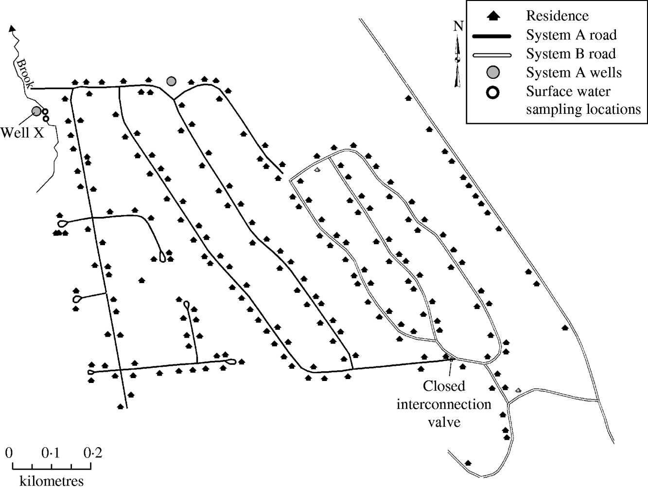 The 205-home community was rurally located in the northeastern part of New Hampshire. Sewer service was not provided to the community, and each home maintained their own on-lot septic system. The community drinking-water system was historically divided into a west (system A) and an east (system B) system (Fig. 1). Although the systems connected at one location through a closed valve, the two systems were functionally separate, each with distinct water sources prior to and during the outbreak. System A was served by two groundwater wells and system B was served by four groundwater wells. The water-supply well types were believed to be drilled in bedrock based on water screening parameters although the depth of each was not known. Water from the six wells was neither treated nor filtered prior to distribution. The four system B wells and one of two system A wells were permitted and approved by NHDES. The second system A well (well X), was located ∼41 ft (12·5 m) from a brook. NHDES regulation requires well placement at least 50 ft (15 m) from surface water. Well X had been brought online by the previous owner of the water system without a NHDES permit. A site visit to the brook revealed prominent evidence of beaver, including beaver chew in the water and presence of a beaver dam. Upstream from the brook was predominantly national forest with a smaller area occupied by a mixed seasonal community; however, no significant human interaction with the brook was identified.