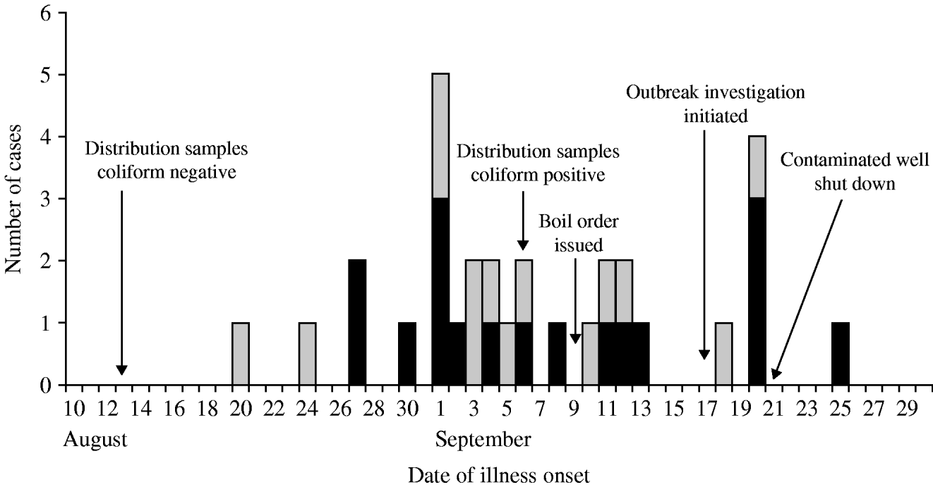 Thirty-one confirmed (n=17) and probable (n=14) cases affecting 27 (63%) of 43 responding system A households were identified; four suspect cases were also identified. No confirmed cases were identified in system B; therefore, no system B residents met the confirmed, probable or suspect case definitions. Of the 31 cases, 18 cases were identified through the cohort study, 12 were dually identified though routine communicable disease surveillance and the cohort study, and one was identified only through routine communicable disease surveillance. Four (15%) of 27 case households were home to two case-patients; in three of the four households, cases became ill several days apart and are potential secondary cases. The median age of cases was 49 years (range 3–83 years). Children aged <5 years accounted for one (3%) of 31 cases. Sixty-one per cent of cases were male. Patients had illness onsets from 20 August to 25 September (Fig. 2). Of 30 patients with clinical information, symptoms reported included diarrhoea (87%), abdominal cramps (83%), fever (23%), vomiting (23%), and bloody diarrhoea (10%). Reported duration of illness ranged from 2 to 30 days. Fourteen (54%) of 26 patients with diarrhoea reported experiencing recurrent diarrhoea, defined as diarrhoea that resolved for more than 1 day and later returned. Eighteen (60%) of 30 cases sought medical care. No deaths or illnesses requiring hospitalization were reported.