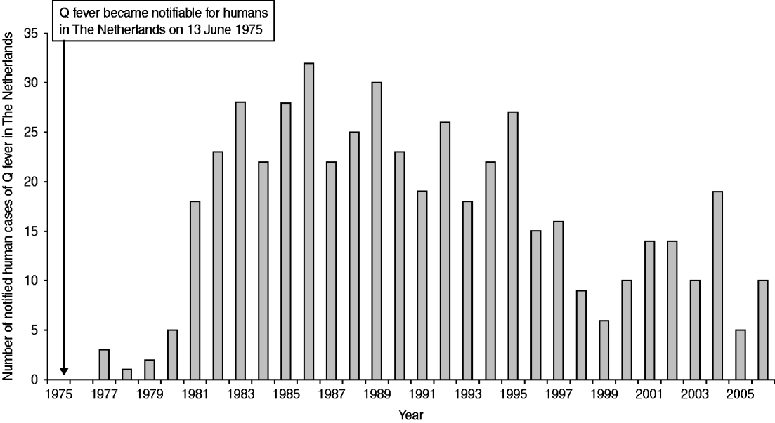In the 1950s a comprehensive survey of the global distribution of Q fever was commissioned by the World Health Organization. In The Netherlands, between 1951 and 1954, almost 10 000 human sera were tested for Q fever with a complement-fixation test and all were negative [Reference Kaplan and Bertagna11, Reference Wolff and Kouwenaar12]. In 1956, the first three human cases were reported in The Netherlands [Reference Westra, Lopes Cardozo and Ten Berg13]. Two patients might have been linked to imported cattle or a visit abroad, while in the third patient there was no obvious cause. In 1958 and 1967 two human Q fever cases were described associated with the handling of imported wool [Reference Jordans14, Reference Terwindt and van Holten15].