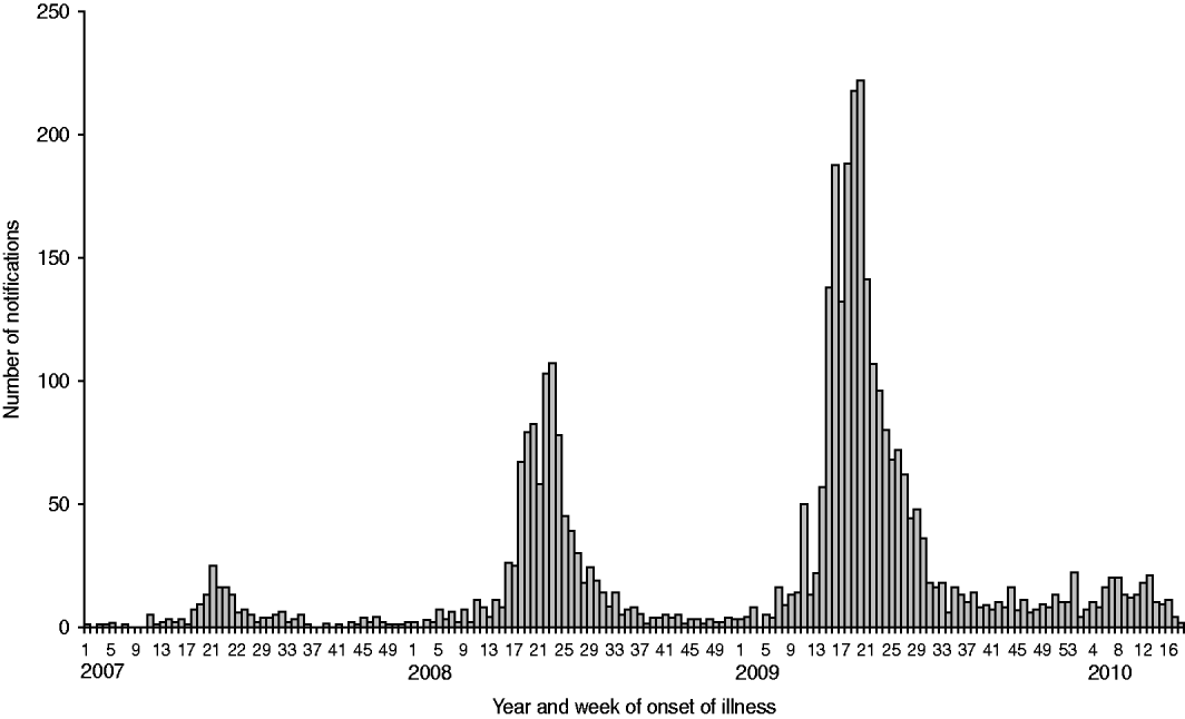 Fig. 2. Number of notified human Q fever cases with a known first day of illness according to the week of onset of symptoms, from 1 January 2007 to 11 May 2010. 2007 (n=168), 2008 (n=1000), 2009 (n=2355), 2010 (n=208). Total number of human cases in 2007–2009 (n=3523) (compiled by F. Dijkstra).