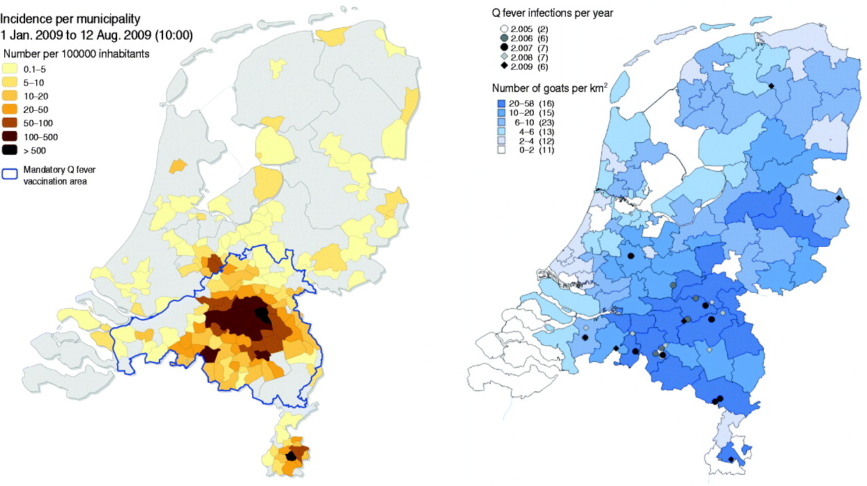 Fig. 3. Map of The Netherlands. Left: Number of human cases in 2007 and 2008. The red line shows the dairy goat and dairy sheep voluntary vaccination area in 2008. Right: Dairy goat farms and dairy sheep farms with Q fever abortion history between 2005 and 2008. [Compiled by National Institute for Public Health and the Environment (RIVM) and Animal Health Service (GD).]