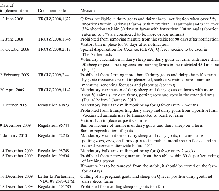 With changing public and political awareness of Q fever, the Outbreak Management Team or expert panels advised the Ministries of Health and Agriculture about additional risk reduction measures. At a meeting in December 2009, experts stated that they expected vaccination would not be sufficiently effective in reducing the excretion of C. burnetii in the 2010 kidding season, due to the fact that not all dairy goats and dairy sheep had been vaccinated before the 2009 breeding season. A more considerable reduction in the possible excretion of C. burnetii and thus, environmental contamination, thereby attempting to reduce human exposure and potential risk to public health in 2010, might be achieved by preventing pregnant Q fever-positive goats on Q fever-positive farms from kidding. These animals were identified as high-risk animals. Veterinary experts from the national veterinary reference institute (the Central Veterinary Institute of Wageningen UR), taking consideration of the findings of Rousset et al. [Reference Rousset47], believed it impossible to distinguish infected pregnant animals from non-infected pregnant animals by laboratory testing prior to the start of the kidding season. This was the basis of the decision to cull all pregnant animals on Q fever-positive farms. In addition, breeding dairy goats and dairy sheep was prohibited until at least June 2010. The culling started in late December 2009 and was completed in June 2010, when a number of temporary animal measures imposed by the government ended and now require revision.