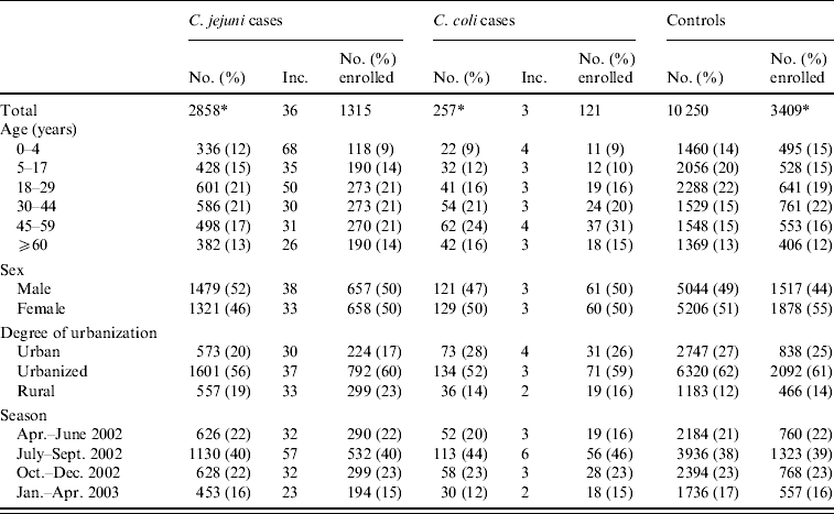 Of the C. jejuni and C. coli cases 1315 (46%) and 121 (47%), respectively, completed a questionnaire. The questionnaire response was higher in the 45–59 years age group (54% and 60%, respectively) and in urbanized (49% and 53%, respectively) and rural (54% and 53%, respectively) areas (Table 1). Of C. jejuni cases, the response was lower for children aged 0–4 years (35%) and for C. coli cases the response was lower for children aged 5–17 years (38%). From April to June 2002, a lower response was observed in C. coli cases (37%), whereas in January to April 2003, a higher response was observed (60%).