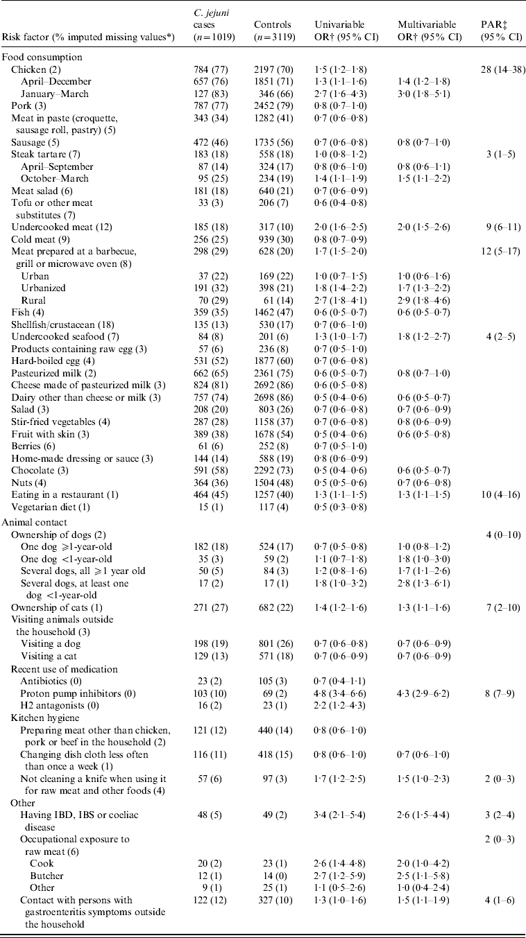 We included a large number of cases and controls in this study, enabling us to study risk factors for different Campylobacter spp. and age-, season- and urbanization-specific risk factors for C. jejuni enteritis. The PAR provided information about the impact of each risk factor on the incidence, whereas the OR provided information about the individual risk of infection after exposure. In general, in order to reduce Campylobacter incidence, the highest impact may be expected from public health interventions targeted at those risk factors displaying the highest PARs.