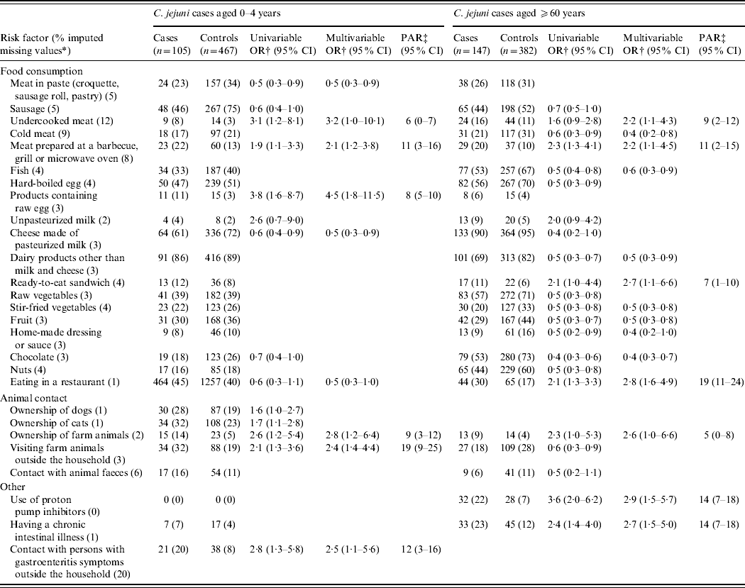 In Table 3 the results of the separate risk analyses for young children (0–4 years) and the elderly (⩾60 years) are displayed. Consumption of undercooked meat and meat prepared at a barbecue, grill or microwave oven remained risk factors in these age-specific models. Visiting farm animals, contact with persons with gastroenteritis symptoms and ownership of farm animals were predominant risk factors for C. jejuni enteritis in young children: an estimated 19%, 12% and 9% of the cases in this age group were attributable to these factors, respectively. Consumption of products containing raw egg was a unique risk factor for young children and was not associated with illness in any other age group. Predominant risk factors for C. jejuni enteritis in the elderly were eating in a restaurant (PAR 19%), use of proton pump inhibitors (PAR 14%) and having a chronic intestinal illness (PAR 14%). Consumption of ready-to-eat sandwiches was a unique risk factor for the elderly.