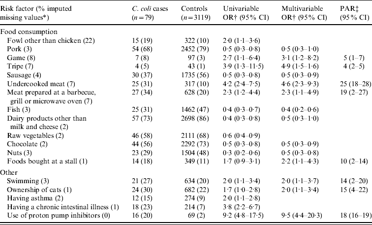 Table 4. Univariable and multivariable logistic regression analyses and population attributable risk of risk factors associated with indigenous Campylobacter coli campylobacteriosis. A case-control study in The Netherlands, April 2002 to April 2003