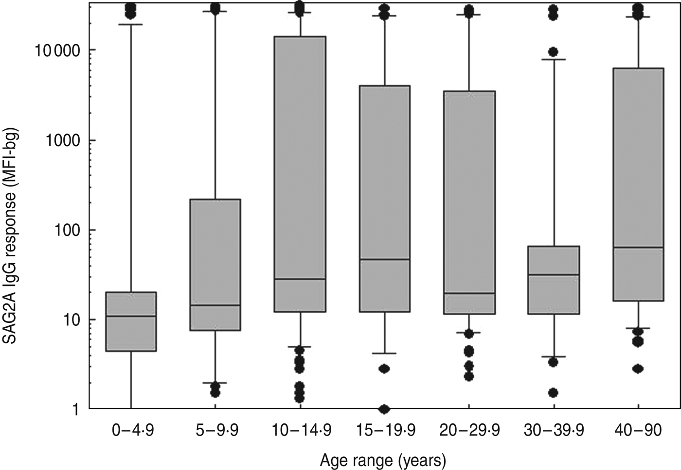 Fig. 3. Age-specific SAG2A antibody response distributions for residents of a community in Haiti. Antibody values determined by multiplex bead assay are plotted vs. the age at the time of sample donation for all of the samples assayed from the cross-sectional community study (n = 383). Boxes include values between the 25th and 75th percentiles, whiskers include values between the 10th and 90th percentile, and outliers are indicated by data points. The median values are indicated within the box by a line.