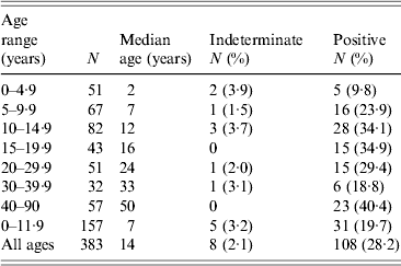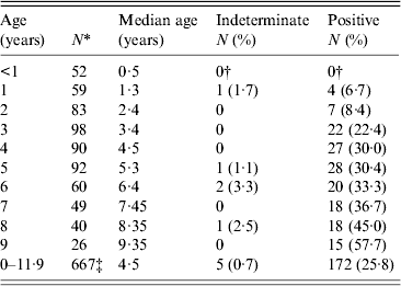 † Four indeterminate and four positive responses observed in children aged <1 year were determined to be of maternal origin and were treated as negatives.