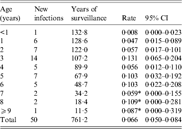 An alpha level of 0·05 was set for tests of statistical significance. Statistical comparisons were performed using SigmaStat for Windows, version 2.03.0 (SPSS Inc., USA). All statistical modeling was conducted in R version 3.0.1 (www.r-project.org). A Kaplan–Meier model cumulative incidence curve was generated using the R survival analysis package [Reference Therneau and Grambsch35]. Indeterminate responses were not considered in the survival analysis and maternal responses were treated as negatives. We estimated the seroconversion rate in the longitudinal cohort using the number of seroconversions divided by the person-time at risk. When calculating person-time, we treated individuals in the cohort as either interval censored (in the case of seroconversions) or as right-censored at the last point of observation (in the case of persistent negatives); we assumed that interval censored individuals seroconverted at the midpoint between the last age they were classified as negative and the first age they were seropositive. Children who were seropositive at their first measurement were excluded from the analysis. We estimated the rate over the entire 11-year period and for each year of age (we classified children aged 9–11 years in the same group due to sparse data in the older age range). We calculated 95% confidence intervals for the seroconversion rate estimates by bootstrap resampling individuals with replacement with 1000 iterations, and used the 2·5% and 97·5% of the bootstrap distribution as the confidence interval.