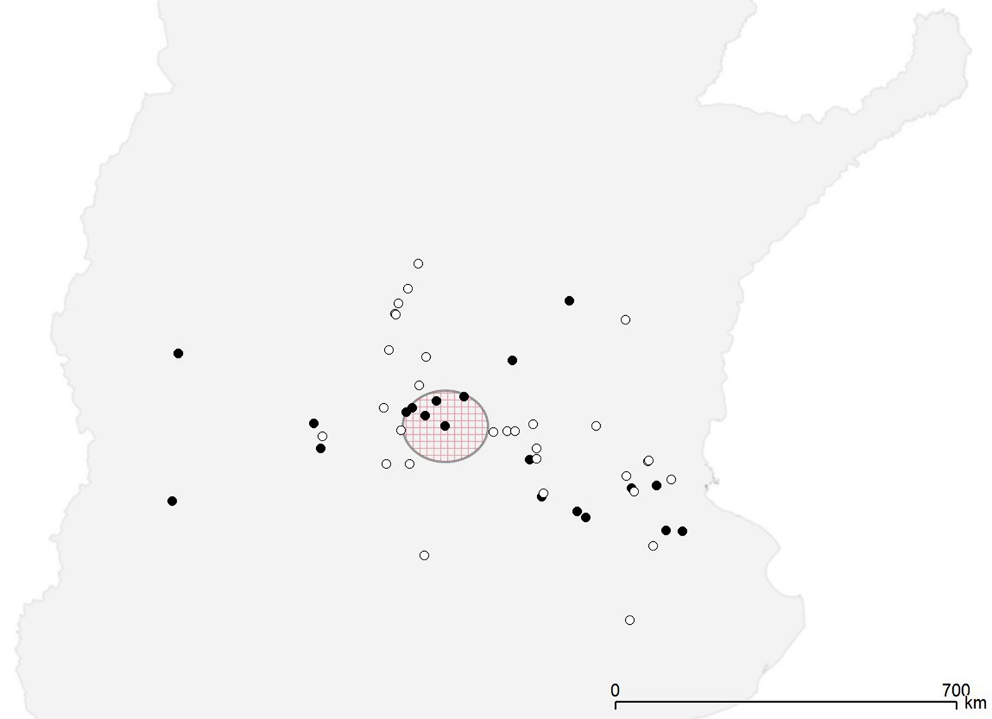 Fig. 1. Spatial distribution of Salmonella-positive (•) and Salmonella-negative (◦) farms. The large circle indicates the presence of a borderline significant (P = 0·08) cluster of high risk.