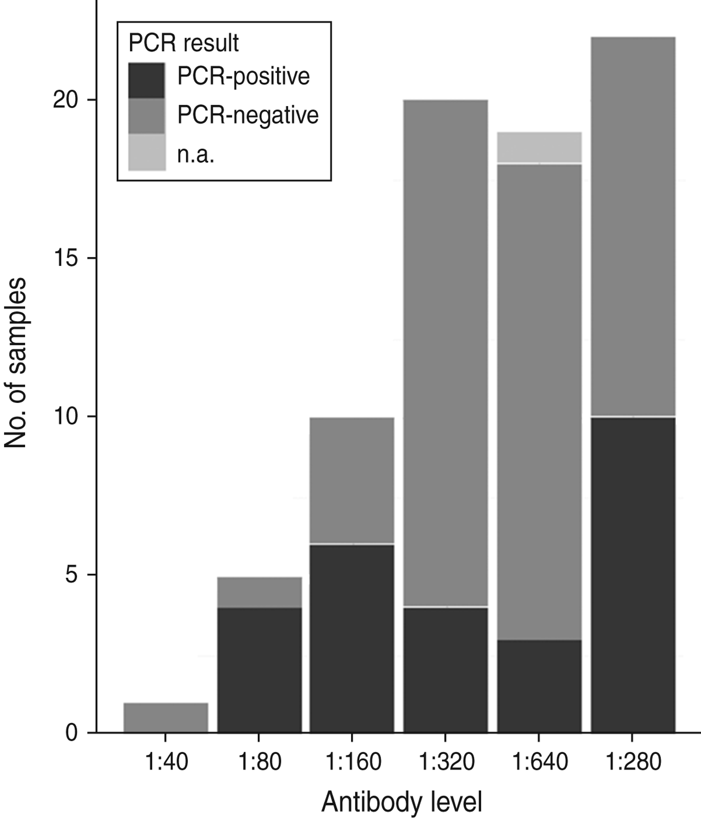 All tested samples were serologically positive (titre ⩾1:40). Titration was performed on 77 samples from 2009 and 2010, with titres ranging from 1:40 to 1:1280. Figure 2 shows an overview of serological titres related to presence of A. phagocytophilum DNA. An additional model fitted to a subset of 77 animals that included A. phagocytophilum titre levels (results not shown) indicated no significant predictive effect of titre levels, but a significant effect (P < 0·001) of body weight when controlled for age.