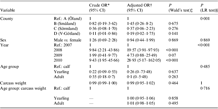 Table 1. Results of a logistical regression model with factors associated with PCR-based detection of Anaplasma phagocytophilum in Swedish moose (Alces alces) spleens