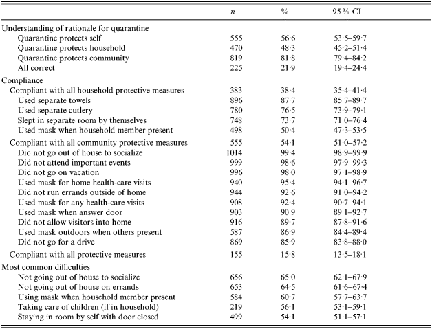 To be effective in preventing transmission to the community and within households, adhering to the SARS quarantine requirements was thought necessary. In a telephone survey of the general public in Toronto, Blenden et al. [Reference Blenden10] found that 97% would agree to quarantine should they be exposed to SARS. The difficulties encountered with the implementation of quarantine as observed here demonstrate the limitations of such hypothetical agreement. Based on self-report, we show that compliance with all requirements was low (15·8%, 95% CI 13·5–18·1), suggesting that quarantine in its current form would be of limited effectiveness in controlling transmission. Household members would be particularly at risk since only 38·4% (95% CI 35·4–41·4) of respondents reported compliance with all household requirements, the least compliant being appropriate mask use. Compliance with quarantine requirements that would be effective in preventing community transmission was significantly higher at 54·1% (95% CI 51·0–57·2) (P<0·001). While compliance with each requirement was high (>85%), overall almost half (45·9%) were non-compliant, potentially putting their communities as risk.