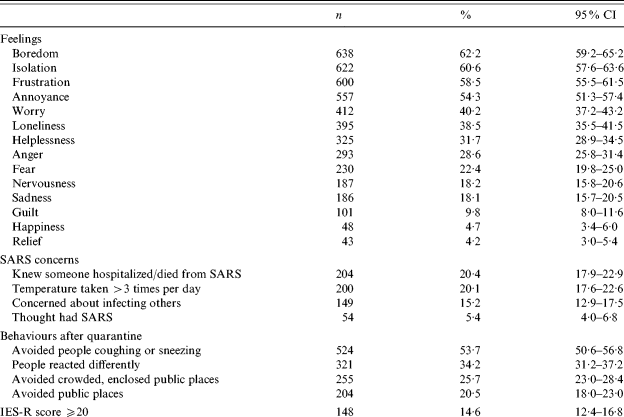 Indicators of the psychological impact associated with quarantine are shown in Table 3. Of the feelings experienced during quarantine, boredom (62·2%, n=638, 95% CI 59·2–65·2), isolation (60·6%, n=622, 95% CI 57·6–63·6), and frustration (58·5%, n=600, 95% CI 55·5–61·5) were most commonly reported. Some respondents expressed other psychological concerns including fears about infecting others, being infected themselves and/or avoidance behaviours people and places after quarantine (Table 3).
