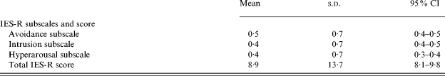 The mean IES-R score was 8·9 (s.d.=13·7, range=0–82) (Table 3). An IES-R score of at least 20 was found for 14·6% of respondents (n=148, 95% CI 12·4–16·8). This cut-point was used to enable comparison with Hawryluck et al. [Reference Hawryluck9]. For the three domains, respondents reported a mean score of 0·5 for avoidance (95% CI 0·4–0·5), 0·4 for intrusion (95% CI 0·4–0·5) and 0·4 (95% CI 0·3–0·4) for hyperarousal. This corresponds to the response anchors of ‘not at all’ distressing for all domains [Reference Weiss, Marmar, Wilson and Keane12].