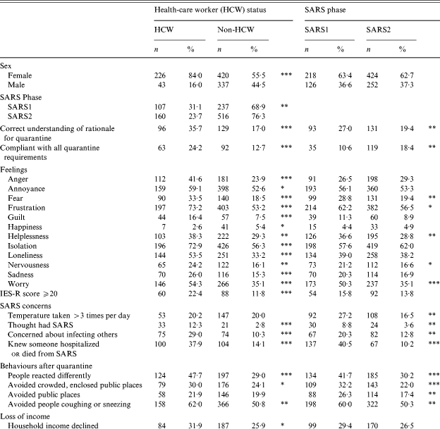 The analyses stratified by HCW status and SARS phase are summarized in Table 4. Only variables that showed a significant difference in either of these strata are shown. In addition, summary variables to indicate overall compliance, correct rationale, and mean difficulty score were used in place of individual questions. Compared with non-HCW, HCW were significantly younger, female, had correct understanding of the rationale for quarantine, were more compliant, felt greater stigmatization (i.e. people reacted differently), exhibited avoidance behaviours, lost income and were consistently more impacted psychologically.