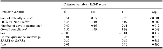 Statistical modelling was conducted to determine the variables offering the best fit for IES-R score. Based on correlation analyses, the following variables were evaluated to determine their contribution to increasing IES-R score: sex, age, correct rationale, HCW status, compliance, SARS phase, number of days in quarantine and difficulty score. Using stepwise linear regression methods, a significant model was produced (F 4,745=35·57, P<0·001 adjusted R 2=0·16) and included increasing difficulty (β=0·51, P<0·001), HCW status (β=3·38, P=0·002), self-reported longer duration of quarantine (β=0·40, P=0·012) and compliance with SARS quarantine requirements (β=2·55, P=0·048) (Table 5).