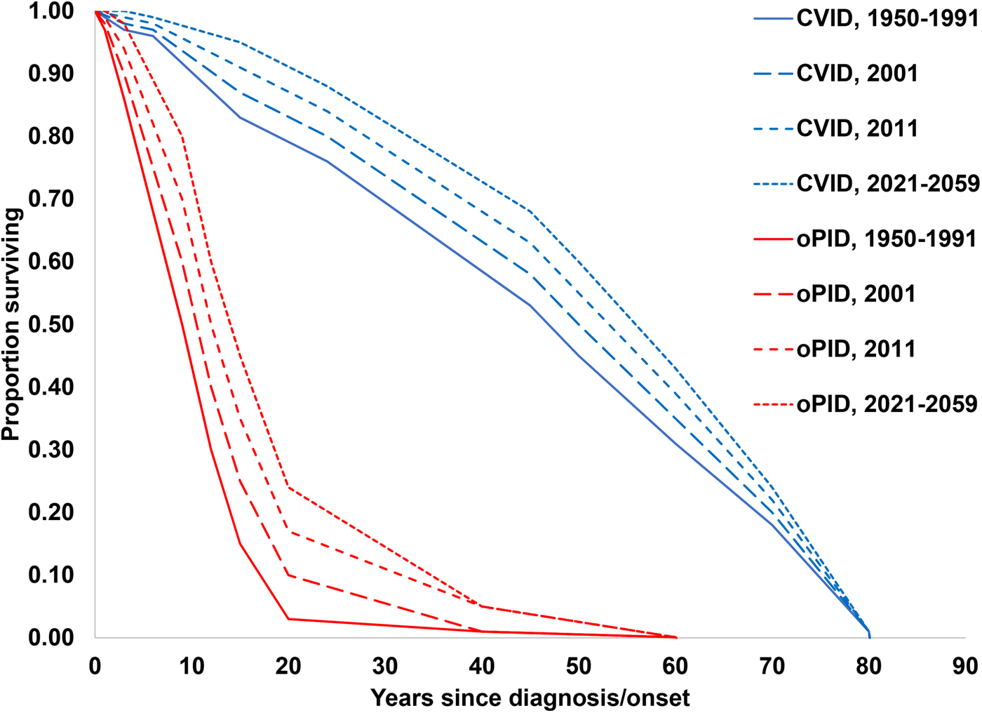 Fig. 1. Assumed baseline survival curves for CVID and oPID patients effectively-treated (with IVIG) in a population with R 0 values for WPV1 of 4 or 5.