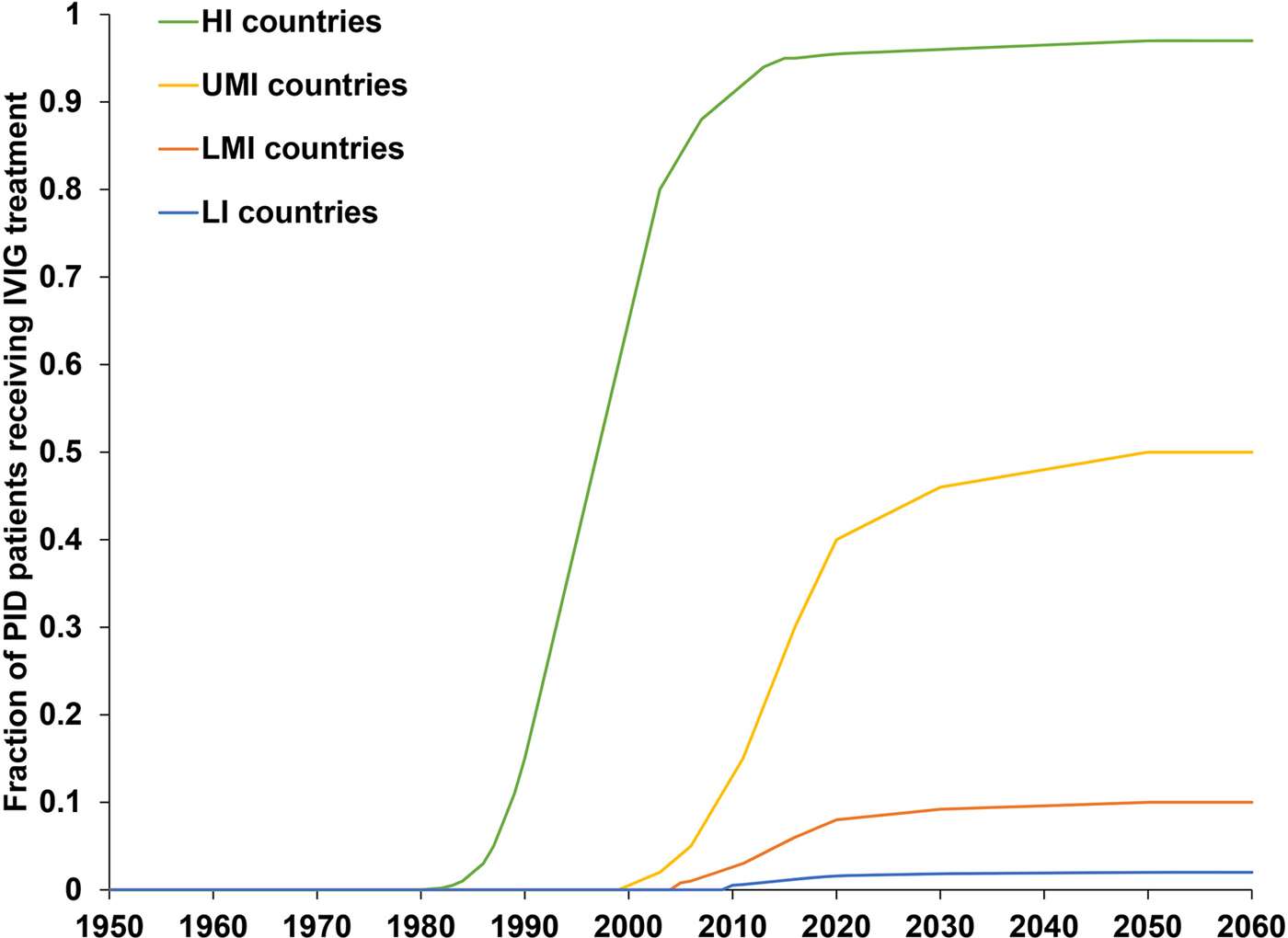 Fig. 2. Assumed fractions of CVID and oPID patients treated with IVIG as a function of time, by income level.