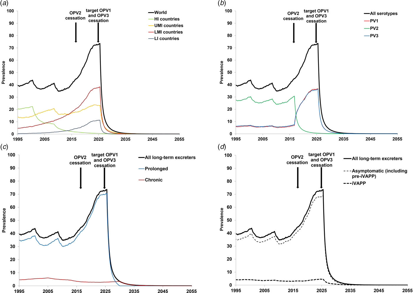 Figure 3 shows the baseline prevalence (i.e. without PAVDs) of long-term iVDPV excreters. Figure 3a shows the prevalence by the income level, which suggests that middle-income countries account for most of the current long-term excreters, while the prevalence in high-income countries continues to decline steadily since these countries stopped all OPV use. Figure 3b shows the impact of stopping serotype 2 containing OPV use (i.e. OPV2 cessation) and assumptions about serotype-specific infections (i.e. a shift to first-infections of individuals with serotypes 1 and 3). Notably, Figure 3b suggests a sharp drop in long-term serotype 2 excreters, but a simultaneous rise in serotype 1 and serotype 3 excreters, caused by the new assumed distribution between serotypes 1 and 3 for the probability of the first OPV infection. Chronic excreters amount to 4–16% of all long-term excreters, most of them residing in HI countries. After the expected global cessation of all OPV use, the prevalence of prolonged excreters drops quickly, while a few chronic excreters continue to exist for over a decade (see Fig. 3c). Only up to 11% of long-term excreters present with iVAPP, while the remainder either recover or die before the paralysis occurs (see Fig. 3d).