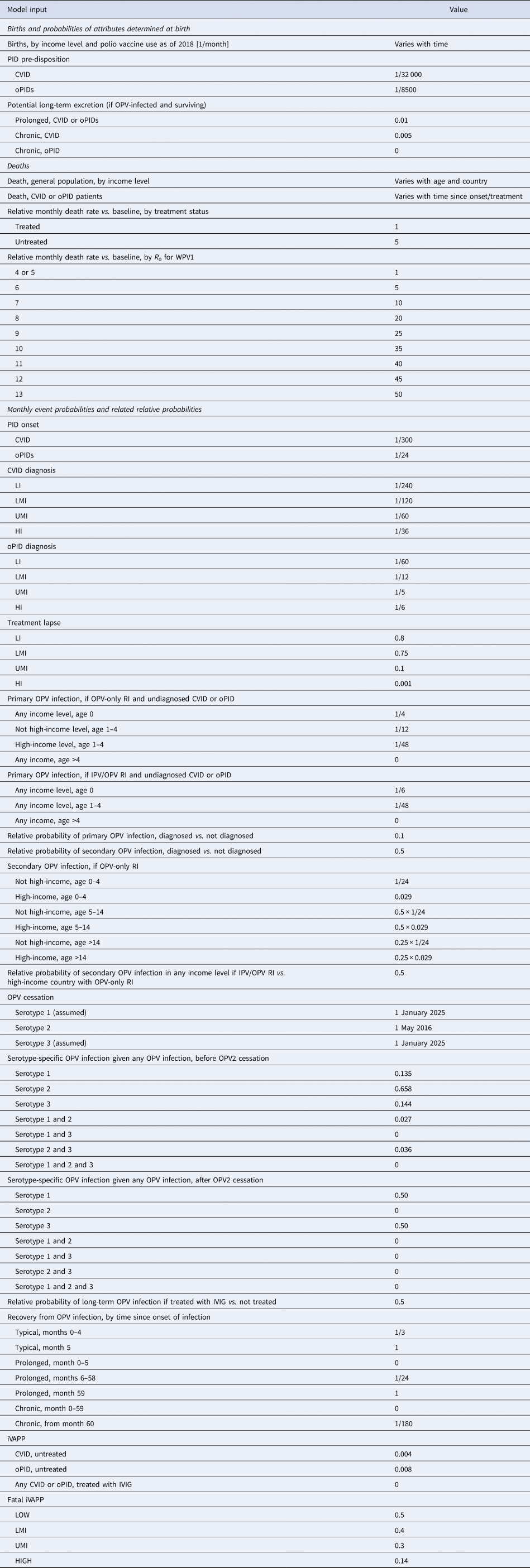 Table 2. Inputs for the updated DES model of long-term poliovirus excreter prevalence [Reference Duintjer Tebbens, Pallansch and Thompson7]