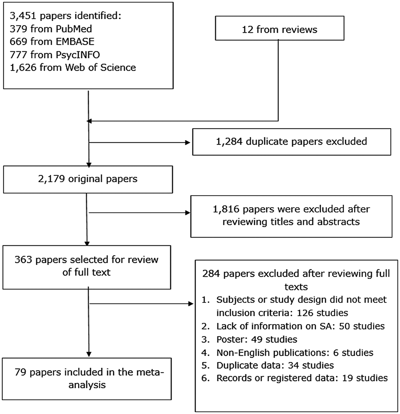 The search initially identified 3451 articles from the target databases and 12 additional articles from other sources (Fig. 1). Altogether, 79 studies covering 33 719 patients met study entry criteria (online Supplementary Table S1), including 58 cross-sectional and 21 cohort studies published between 1985 and 2018. Twenty, six and four studies employed consecutive, convenience and random sampling, respectively. In terms of diagnosis, 71 and four studies applied the DSM and Research Diagnostic Criteria (RDC) (Spitzer et al., Reference Spitzer, Endicott and Robins1978), respectively, and one study each used the ICD, the DSM or/and ICD, DSM or/and RDC, the Affective Disorder Evaluation (ADE) (Sachs et al., Reference Sachs, Thase, Otto, Bauer, Miklowitz, Wisniewski, Lavori, Lebowitz, Rudorfer and Frank2003). The mean age of the whole sample ranged between 29.0 and 55.8 years, and then proportion of males ranged from 23.3 to 72.1%. Seventy-five of the 79 studies reported lifetime prevalence, three studies reported 1-year prevalence and three reported current episode prevalence of SA. The total score of quality assessment ranged from 4 to 8, with six studies rated as of high quality, and 73 studies as of moderate quality (online Supplementary Table S3).