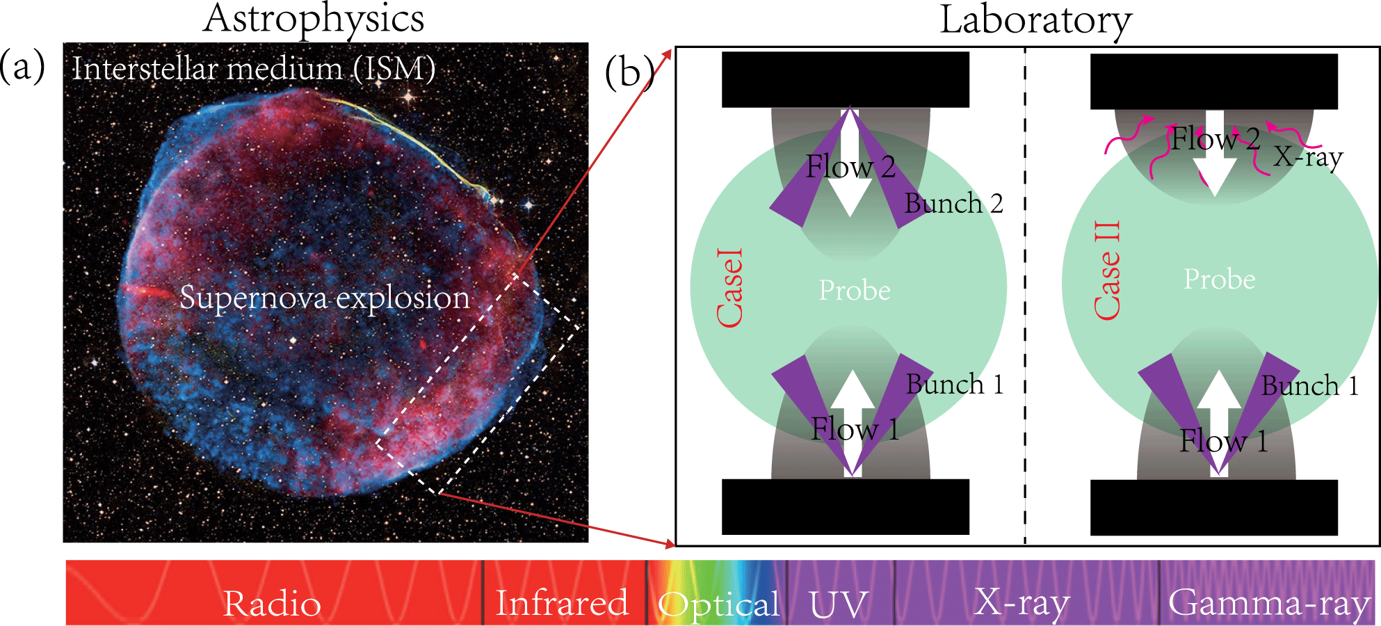 Figure 1. (a) A composite image of collisionless shock formed in the SNRs[18]. Color stands for the observation wavelength, as shown in the color bar. (b) The experimental configurations to simulate the astrophysical CPFs. Here, two schemes are used to generate counter-streaming flows. Case I is a symmetrical one, where both flows are directly ablating both facing surfaces of the foils. Case II is an unsymmetrical one, where only one foil is ablating by one bunch and the other side foil is heated by the X-ray from laser–target interaction. The probe beam (outwards) transversely passes through the interaction region for optical diagnostics.