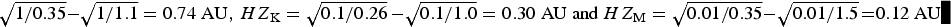 $ \sqrt {1/0.35} - \sqrt {1/1.1} = 0.74\;{\rm AU}, \ HZ_{\rm K} = \sqrt {0.1/0.26}\, {-} \sqrt {0.1/1.0} = 0.30\;{\rm AU} \hbox{ and }HZ_{\rm M} = \sqrt {0.01/0.35} -\sqrt {0.01/1.5}\, {=} 0.12\;{\rm AU}$