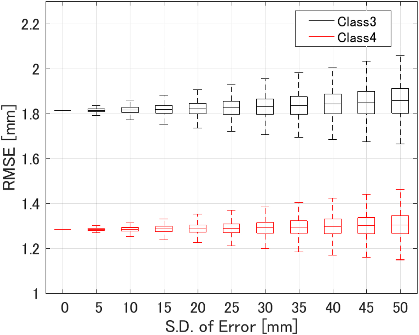 Fig. 11. RMSE of ablation zone boundary estimations as a function of the S.D. of errors in the assumed receiver locations for 1000 different instances in each phantom.