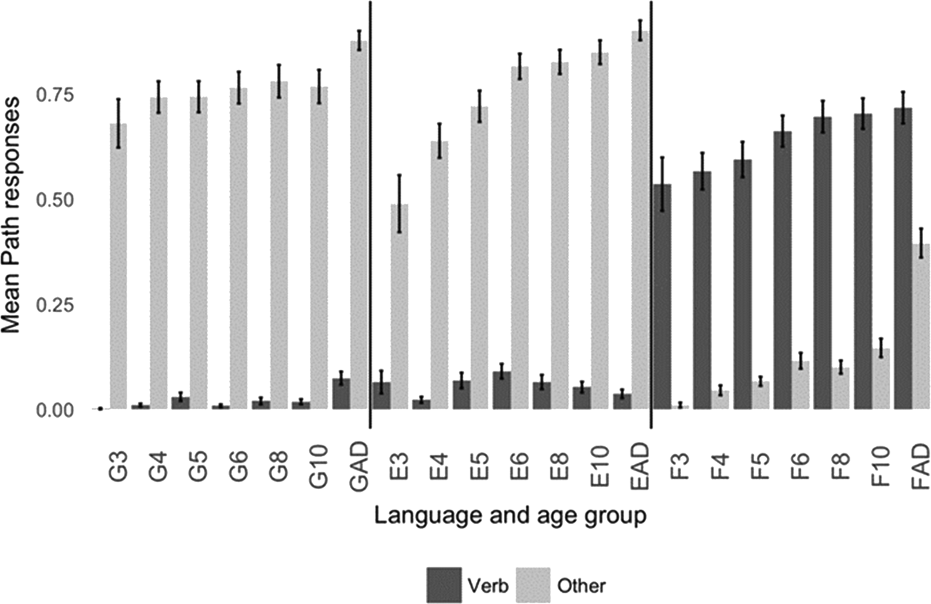 Figure 2. Mean Path responses in verb vs. other devices (G = German, E = English, F = French).Footnote 6