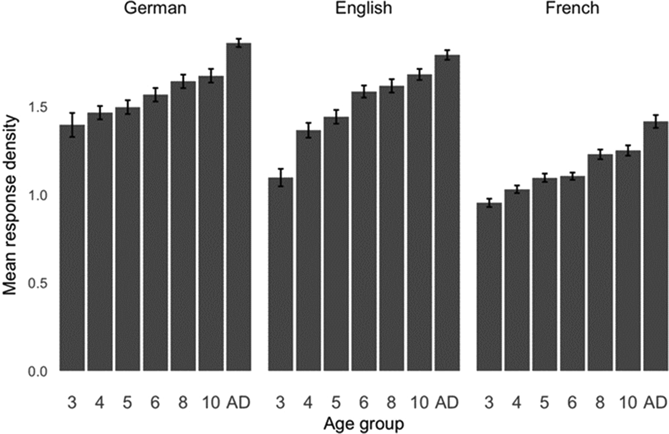 However, as shown in Figure 3, language and age also interacted significantly. Although density increases in all three languages, the developmental path before the age of eight looks distinctly different for English children (steeper developmental curve) compared to French and German children. From eight years onwards, the developmental path is similar across all ages.