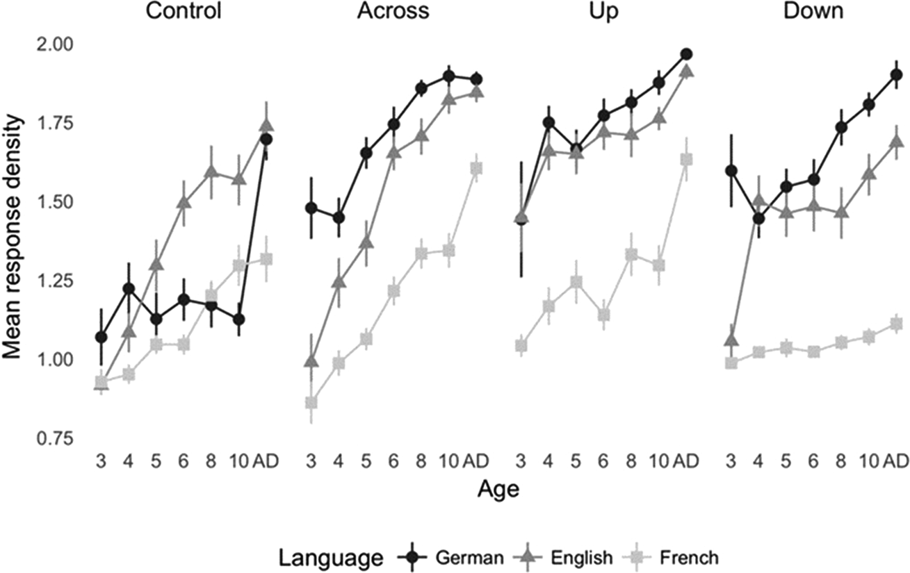 A three-way interaction between item type, age and language is also significant, indicating that the developmental trends in density fluctuate to some extent with item types, as well as with age and language. Thus, English density seems least impacted by item type, showing a clear increase in all item types, German density seems to increase only with control items but is relatively high from three years with the test items, and finally density in French again seems to be most influenced by item type: an increase in density over age in this language is almost non-existent for down items, slightly more prominent for control items and most prominent for up and across items.