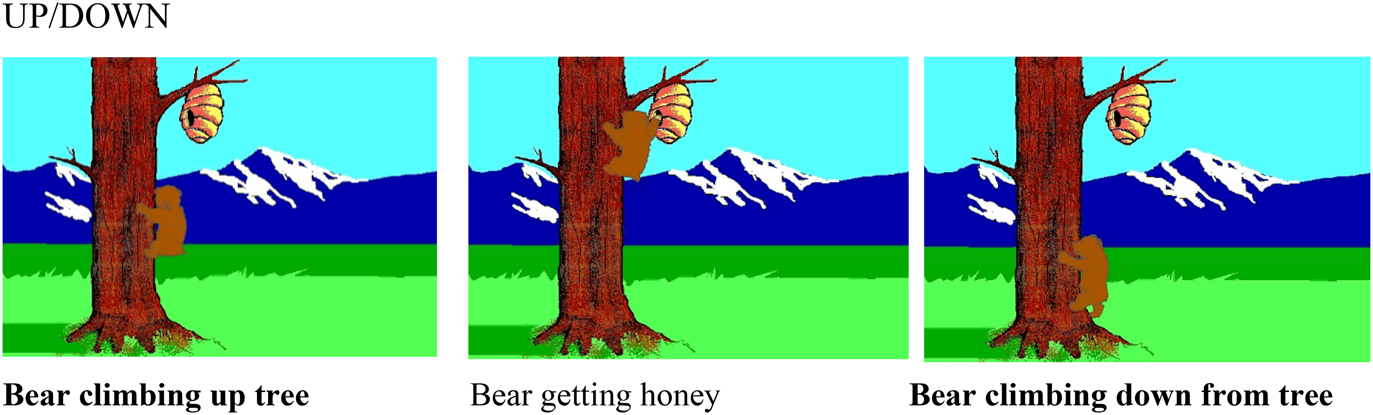 Test items (up, down, across) included three parts: a beginning (scene setting), a middle part including the targeted information (target motion event), and an ending (Figure leaving scene). The target motion events were carefully controlled for and provided a clear Path (as in the item names) combined with typical Manners (crawling, climbing for animals, walking, cycling for humans). To make the cartoons more varied and interesting, the beginning and end parts were less controlled for. Analyses therefore focus on target motion events only. Appendix 1 summarizes all items and highlights (in bold) the targeted events. Appendix 2 illustrates one up and down item, an across item and a control item.