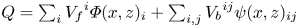 We denote by ${{V_{b}}}^{ij}$ the volume of the liquid bridge between particles $i$ and $j$. The volume of the liquid film on particle $i$ is denoted by ${{V_{f}}}^{i}$ . We denote the Gaussian coarse-graining function with a width of one particle diameter by $\varPhi (x,z)_i$, centred around the position of particle $i$. We denote the normalised integral of the Gaussian coarse-graining function along the branch vector between particles $i$ and $j$ by $\psi (x,z)_{ij}$, see Weinhart et al. (Reference Weinhart, Thornton, Luding and Bokhove2012a). Then the liquid concentration at position $(x,z)$ is given by $Q = \sum _i {{V_{f}}}^{i} \varPhi (x,z)_i + \sum _{i,j} {{V_{b}}}^{ij} \psi (x,z)_{ij}$. See Weinhart et al. (Reference Weinhart, Thornton, Luding and Bokhove2012b) for more details and the notation.