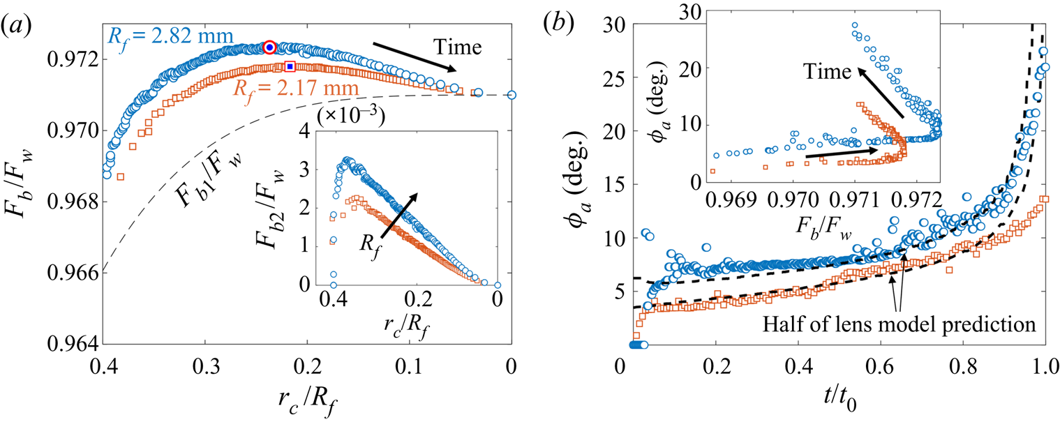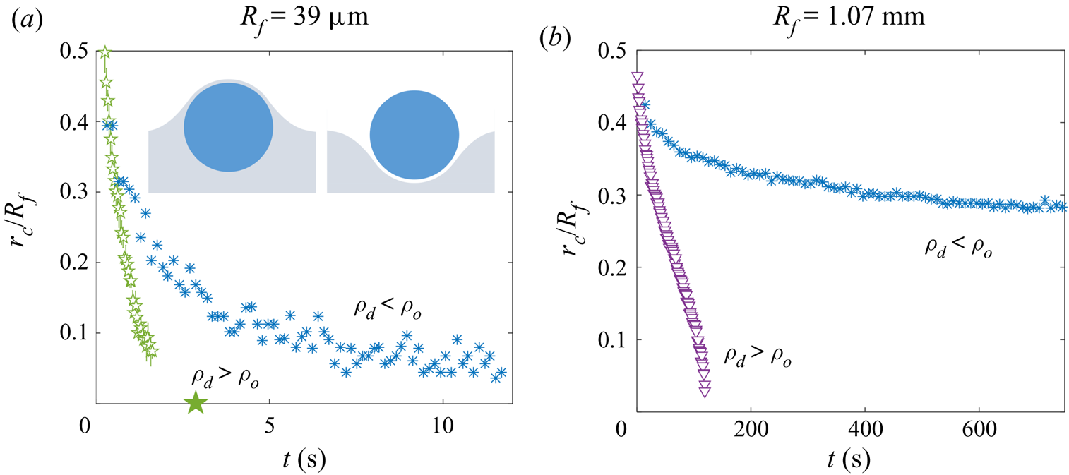 $r_c$ appearing to tend to a constant value, as inferred from the continuously decreasing gradient of the data in figure 16(b). This suggests that the system is tending towards an equilibrium state, sketched in the inset of figure 16(a), in which the droplet is cloaked, floating at the surface of the oil. In this configuration, buoyant forces on the droplet are balanced by the drop's weight and capillary stresses in the cloaking layer (distinct from the capillary stresses localised to a contact line for partially wetting liquid lenses). This is comparable to the situation at the end of stage 1, also sketched in the inset, when the droplet rests on a cushion of air. While the air film ultimately ruptures, the oil cloak in stable due to the effects of disjoining pressure (Schellenberger et al. Reference Schellenberger, Xie, Encinas, Hardy, Klapper, Papadopoulos, Butt and Vollmer2015).