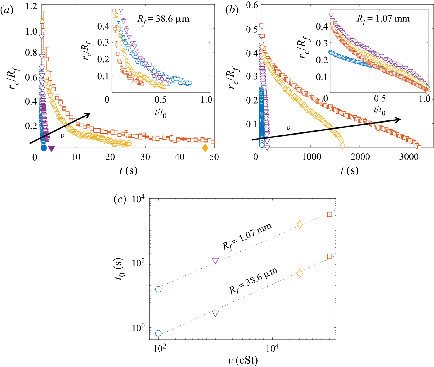 $\nu _{threshold}\approx \sqrt {2R_f\gamma _{do}/\rho _{o}}$. This corresponds to a situation wherein inertia–capillary waves are dissipated over time scales comparable to or less than a single period of oscillation, and should therefore not significantly affect the dynamics of engulfment. Figure 15(d) shows