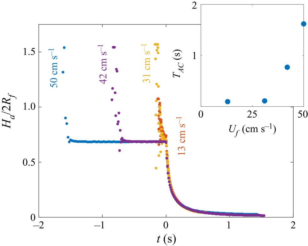 $H_a/2R_f$ of the droplet cap above the oil surface (see figure 6) for four impact velocities