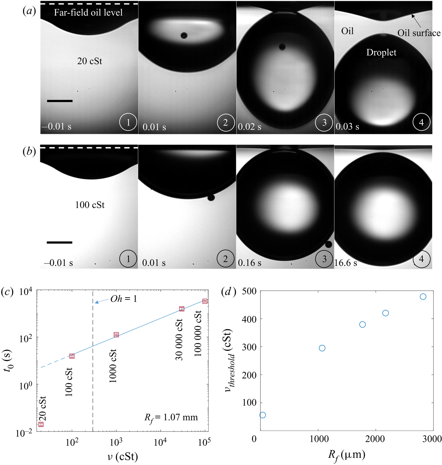$R_f=1.07$ mm deposited on 20 and 100 cSt oils, respectively. The droplet and oil phases are labelled, as is the far-field level of the oil surface, away from the perturbed region around the droplet. Light is refracted at the curved oil and droplet surfaces, reducing the intensity of light transmitted to the camera objective. Hence, the droplet–air interface is not visible through the oil surface, and the droplet appears brightest within a central region. The times indicated are measured relative to the rupture of the air cushion. The stages of engulfment (1–4; see § 1) are indicated in the bottom right corner of each image. Scale bars are 0.5 mm. (c) The time