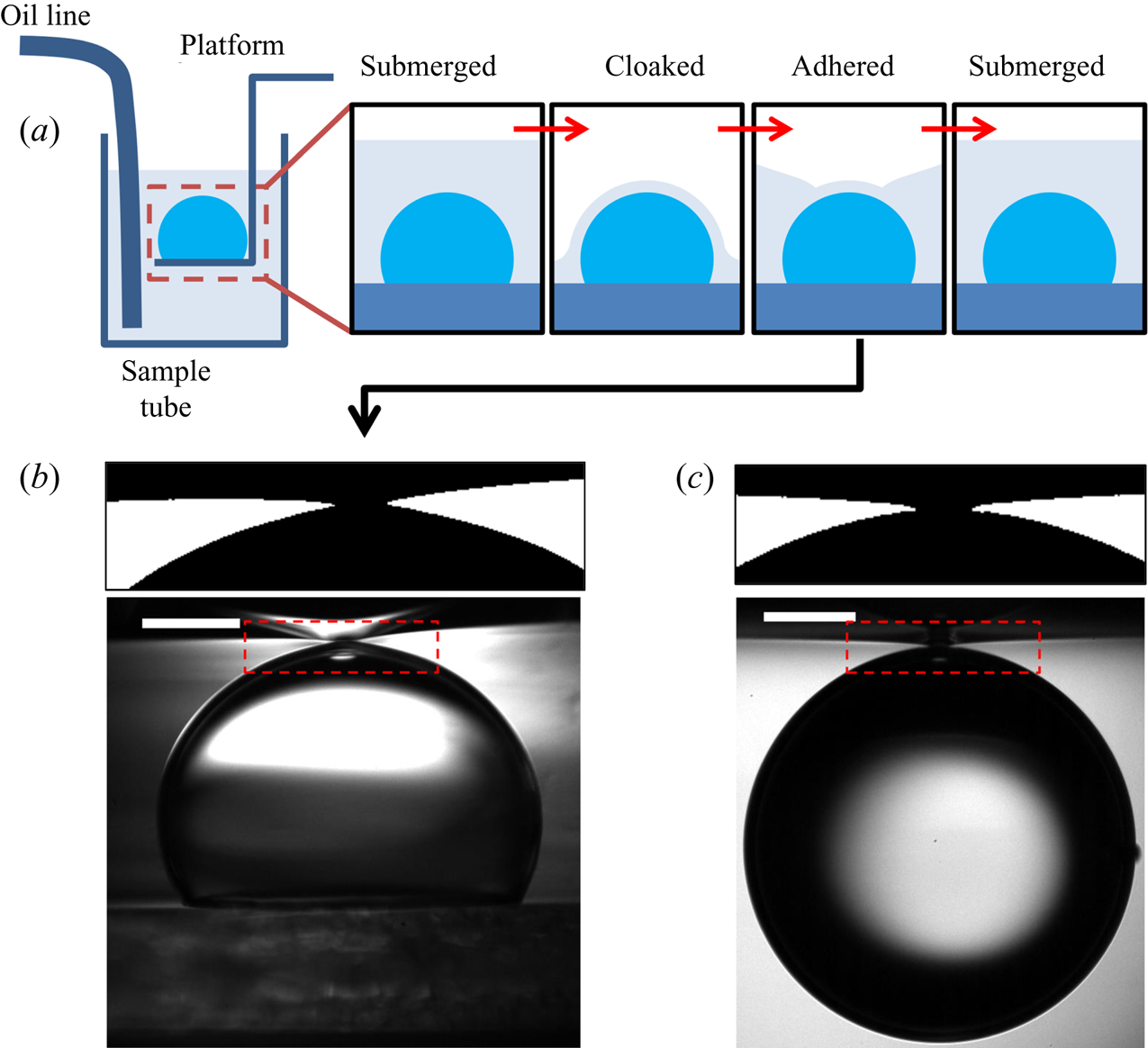Figure 17. Oil surface adhesion for oil-cloaked droplets. (a) Experimental set-up and procedure. (b,c) Side view comparison of (b) an oil-cloaked droplet during the flooding of the sample tube and (c) a droplet during stage 3 of engulfment. Panel (a) shows enlarged views of the regions in the dashed boxes, where the oil–air and droplet–oil surfaces meet. The images have been binarised so that the oil phase appears white. Scale bars are 0.5 mm. The asymmetry of the oil surface profile in (b) is caused by meniscus effects due to the proximity of the droplet to the sample tube walls. This effect is absent in the much larger Perspex boxes used for (c). Oils of kinematic viscosity 100 cSt were used in both cases.
