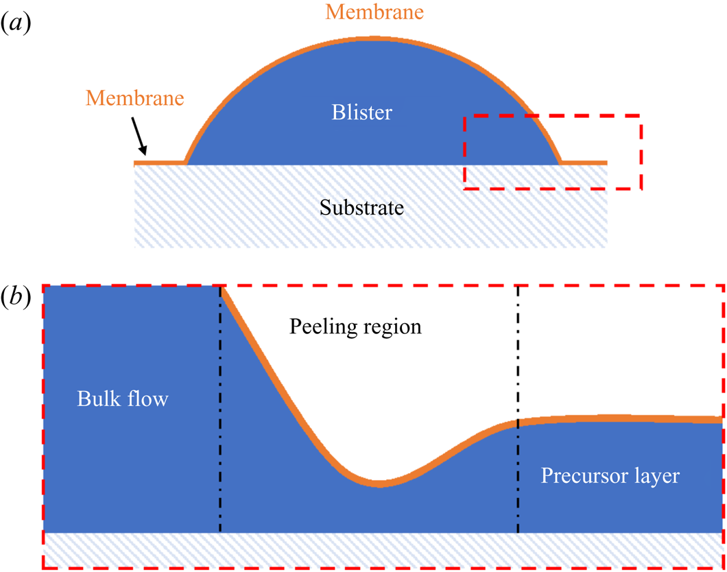Figure 2. (a) Schematic diagram of a peeling flow for a blister of fluid under a membrane. (b) Close up of the boxed region in (a). The ‘peeling region’ around the edge of the blister separates the static precursor layer from the advancing bulk of the liquid phase.