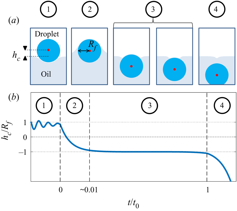 $t=t_0$ at which the droplet detaches from the oil surface. Detachment marks the start of stage 4, during which the droplet sinks into the slightly less dense oil. This final stage is sedimentation and is well characterised: the droplet sinks under its own weight, resisted by buoyancy and viscous drag, predominantly within the oil phase (Hadamard Reference Hadamard1911; Rybcznski Reference Rybcznski1911; Brenner Reference Brenner1962; Taylor & Acrivos Reference Taylor and Acrivos1964).
